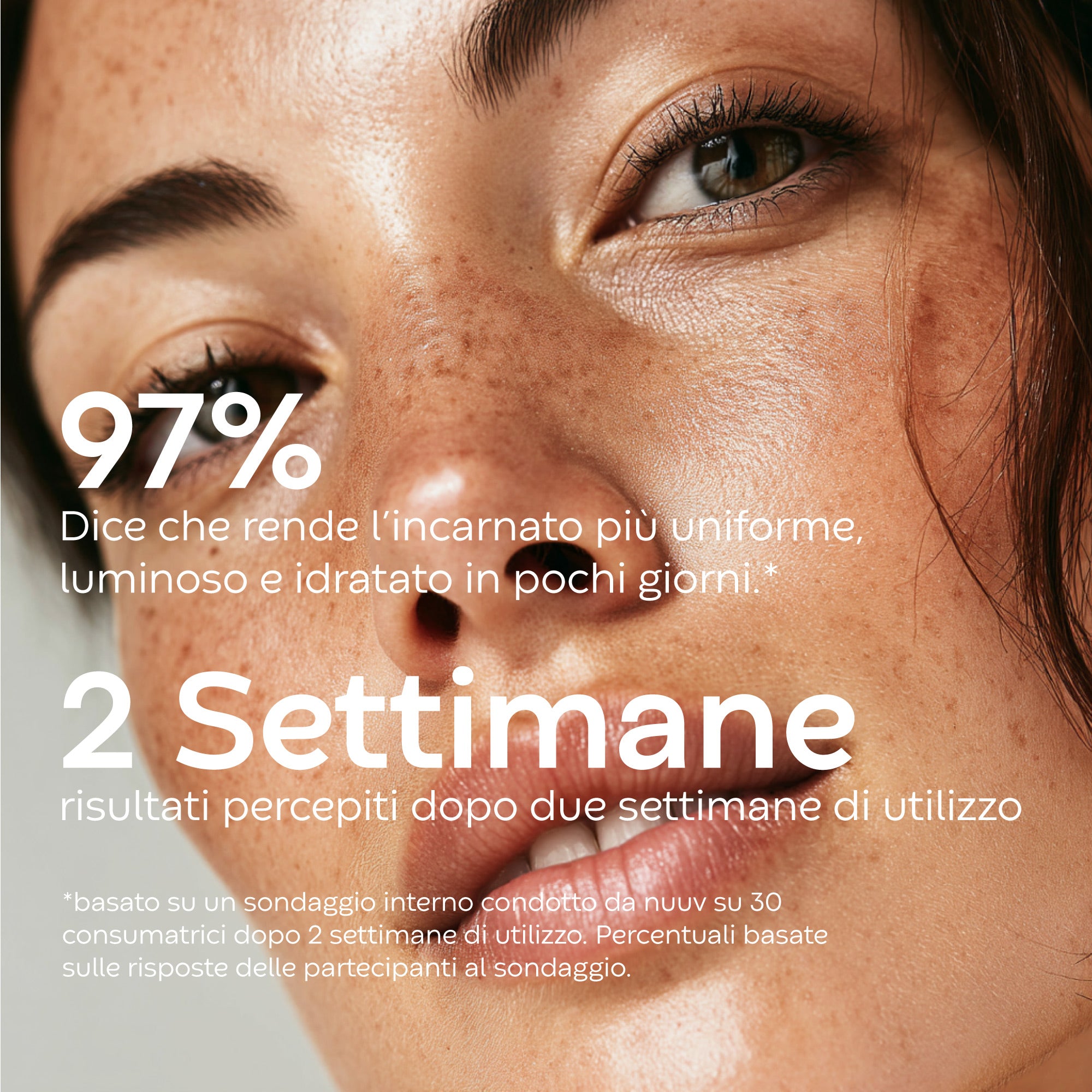 L’azione dei suoi attivi - tra cui acido ialuronico, niacinamide ed estratti botanici - aiuta a uniformare il tono, affinare la grana cutanea e proteggere la pelle. migliorandone elasticità, compattezza e vitalità.