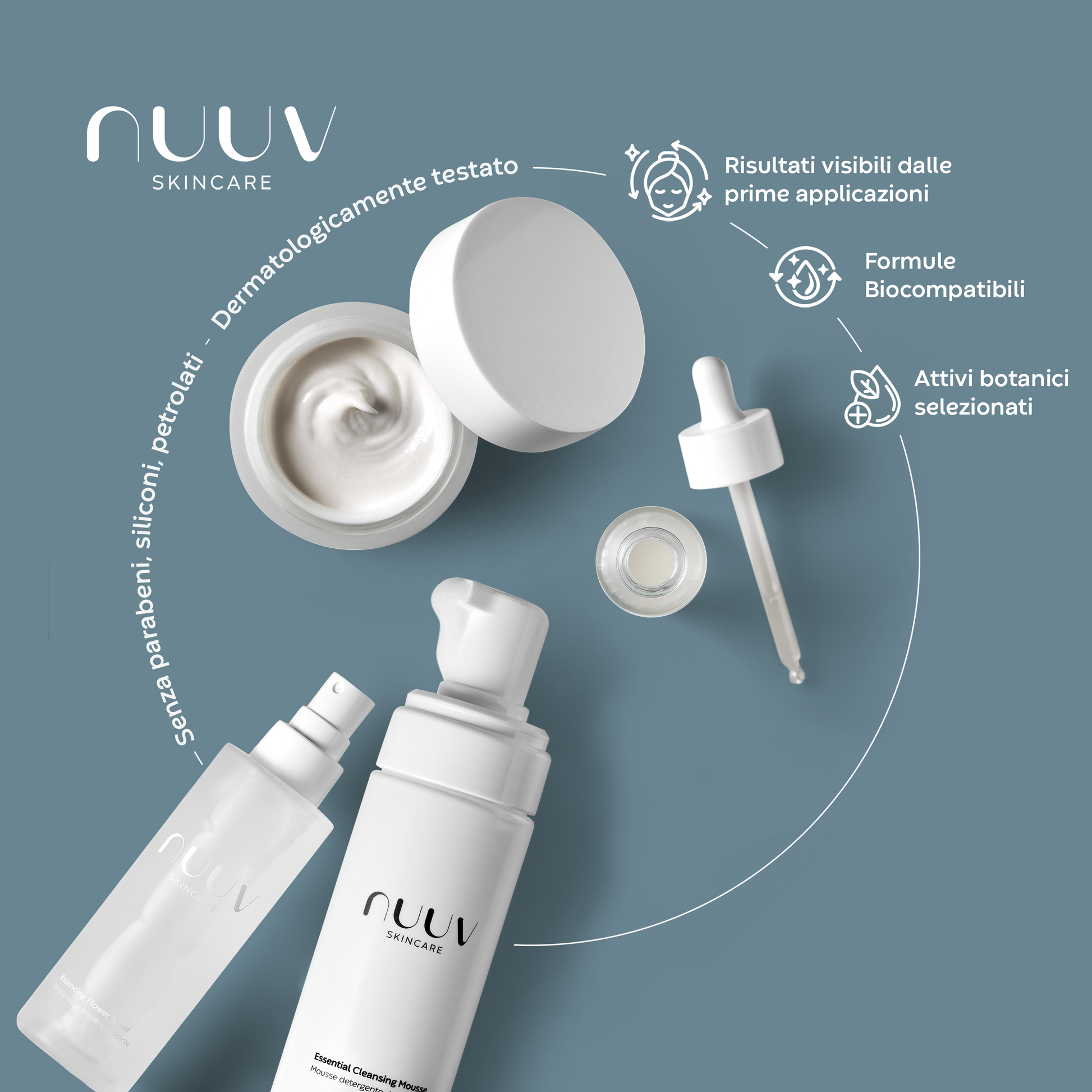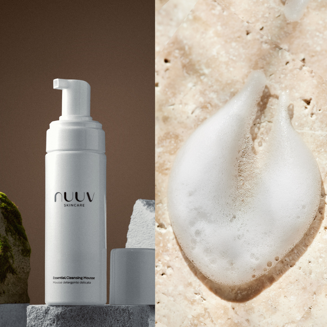Il primo step è l'Essential Cleansing Mousse, una mousse delicata, arricchita con acque lenitive di aloe e camomilla, che rimuove impurità e sebo, rispettando l'equilibrio cutaneo.