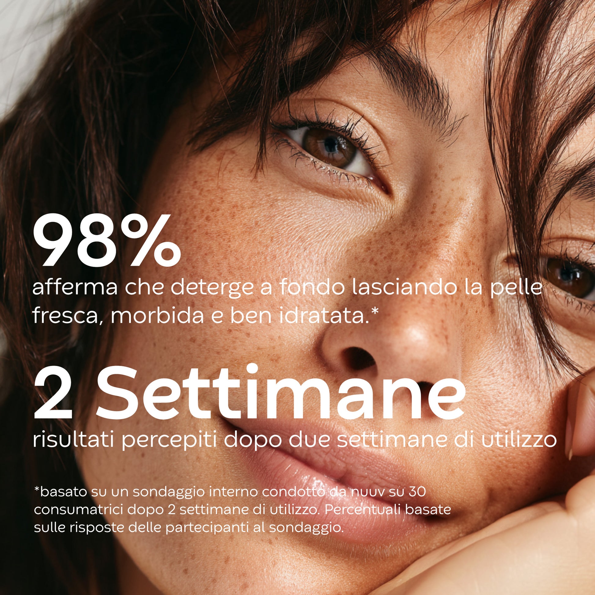 La sua texture leggera si trasforma in una schiuma che deterge delicatamente il viso, lasciandolo fresco e pulito.