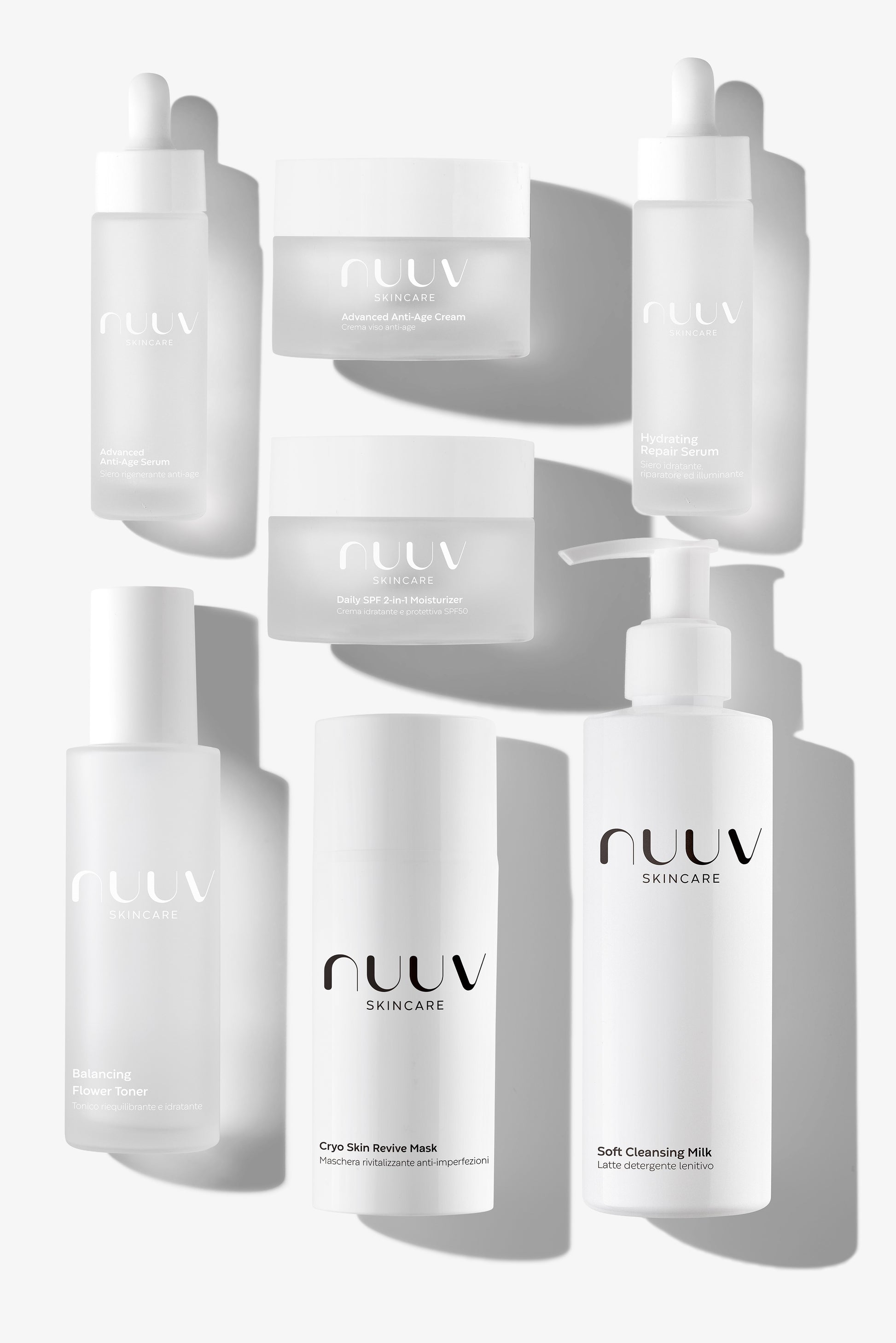 Segue l’Advanced Anti-Age Cream, crema ad azione globale, ideata per contrastare i segni del tempo e restituire benessere, tono e vitalità alla pelle. Formulata con attivi d'eccellenza, come esosomi e peptidi biomimetici, stimola il turnover cellulare, leviga, nutre e rinnova visibilmente tono ed elasticità cutanea.