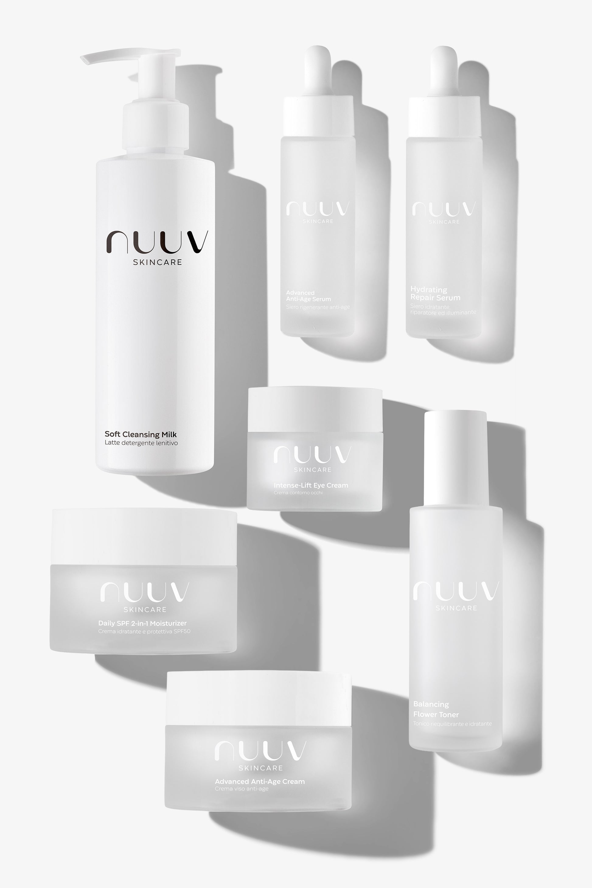 Soft Cleansing Milk AQUA, ETHYLHEXYL STEARATE, OCTYL PALMITATE, ALCOHOL, CHAMOMILLA RECUTITA EXTRACT, PROPYLENE GLYCOL, COCAMIDOPROPYL BETAINE, CETEARYL GLUCOSIDE, POTASSIUM CETHYL PHOSPHATE, ETHYLHEXYLGLYCERIN, CAPRYLYL GLYCOL, PENTYLENE GLYCOL, PARFUM Balancing Flower Toner AQUA, CITRUS AURANTIUM AMARA FLOWER EXTRACT, CITRIC ACID, SODIUM BENZOATE, POTASSIUM SORBATE, ETHYLHEXYLGLYCERIN, PENTILENE GLYCOL, CAPRYLYL GLYCOL, GLYCERIN, PANTHENOL, OPUNTIA FICUS-INDICA STEM EXTRACT, NIACINAMIDE, SODIUM HYALURONATE, POLYGLYCERYL-4 CAPRATE Intense-Lift Eye Cream AQUA, CENTAUREA CYANUS EXTRACT, ORYZA SATIVA BRAN OIL, PRUNUS AVIUM SEED OIL, GLYCERIN, UNDARIA PINNATIFIDA EXTRACT, CORALLINA OFFICINALIS EXTRACT, ACETYL HEXAPEPTIDE-8, MOMORDICA CHARANTIA FRUIT EXTRACT, PHOSPHOLIPIDS, CETEARYL GLUCOSIDE, PALMITOYL TRIPEPTIDE-38, POTASSIUM CETYL PHOSPHATE, ETHYLHEXYLGLYCERIN, CAPRYLYL GLYCOL, PENTYLENE GLYCOL, CAFFEINE, DIOSCOREA OPPOSITA ROOT EXTRACT, PUNICA GRANATUM EXTRACT, XANTHAN GUM, TOCOPHEROL, TETRASODIUM GLUTAMATE DIACETATE Hydrating Repair Serum AQUA, PUNICA GRANATUM EXTRACT, HYDROGENATED ARGANIA SPINOSA KERNEL OIL, GLYCERIN, PANTHENOL, CETEARYL GLUCOSIDE, ETHYLHEXYLGLYCERIN, CAPRYLYL GLYCOL, PENTYLENE GLYCOL, CITRUS PARADISI FRUIT EXTRACT, CITRULLUS LANATUS FRUIT EXTRACT, PHOSPHOLIPIDS, HYDROLYZED GRAPE SKIN, CITRIC ACID, SODIUM BENZOATE, POTASSIUM SORBATE, SODIUM HYALURONATE, XANTHAN GUM, PARFUM, TETRASODIUM GLUTAMATE DIACETATE, BENZYL SALICYLATE, HEXYL CINNAMAL Advanced Anti-Age Serum AQUA, CENTELLA ASIATICA EXTRACT, ETHYLHEXYLGLYCERIN, CAPRYLYL GLYCOL, PENTYLENE GLYCOL, PALMITOYL TRIPEPTIDE-5, ACETYL DECAPEPTIDE-3, CITRUS PARADISI FRUIT EXTRACT, CITRULLUS LANATUS FRUIT EXTRACT, PHOSPHOLIPIDS, NIACINAMIDE, CERAMIDE NP, CERAMIDE AP, CERAMIDE EOP, PHYTOSPHINGOSINE, CHOLESTEROL, BEHENIC ACID, POLYGLYCERYL-10 STEARATE, POLYGLYCERYL-6 BEHENATE, CETEARYL ALCOHOL, GLYCERYL STEARATE, GLYCERIN, SODIUM CETEARYL SULFATE, TRIETHYL CITRATE, SODIUM LEVULINATE, ETHYLHEXYL STEARATE, UBIQUINONE, SODIUM HYALURONATE, ASCORBYL PALMITATE, XANTHAN GUM, PARFUM, TETRASODIUM GLUTAMATE DIACETATE, BENZYL SALICYLATE, HEXYL CINNAMAL Advanced Anti-Age Cream AQUA, CENTAUREA CYANUS EXTRACT, SIMMONDSIA CHINENSIS SEED OIL, PRUNUS AVIUM SEED OIL, CETEARYL GLUCOSIDE, POTASSIUM CETHYL PHOSPHATE, GLYCERIN, ETHYLHEXYLGLYCERIN, CAPRYLYL GLYCOL, PENTYLENE GLYCOL, SODIUM HYALURONATE, PALMITOYL TRIPEPTIDE-5, ACETYL HEXAPEPTIDE-8, CITRUS PARADISI FRUIT EXTRACT, CITRULLUS LANATUS FRUIT EXTRACT, PHOSPHOLIPIDS, NIACINAMIDE, CENTELLA ASIATICA EXTRACT, XANTHAN GUM, GANODERMA LUCIDUM EXTRACT, TOCOPHEROL, PARFUM, TETRASODIUM GLUTAMATE DIACETATE, BENZYL SALICYLATE, HEXYL CINNAMAL Daily SFP 2-in-1 Moisturizer AQUA, ALOE BARBADENSIS EXTRACT, BIS-ETHYLHEXYL OXYPHENOL METHOXYPHENYL TRIAZINE, ORYZA SATIVA BRAN OIL, PONGAMIA GLABRA EXTRACT, GLYCYRRHIZA GLABRA ROOT EXTRACT, PHOSPHOLIPIDS, SQUALANE, CETEARYL GLUCOSIDE, CETEARYL ALCOHOL, POTASSIUM CETYL PHOSPHATE, ETHYLHEXYLGLYCERIN, CAPRYLYL GLYCOL, PENTYLENE GLYCOL, GLYCERIN, PANTHENOL, XANTHAN GUM, TOCOPHEROL, PARFUM, TETRASODIUM GLUTAMATE DIACETATE, BENZYL SALICYLATE, HEXYL CINNAMAL